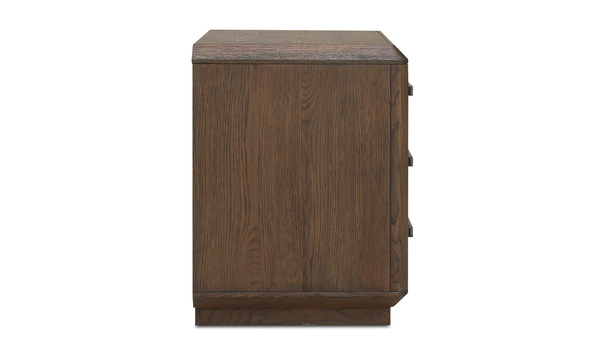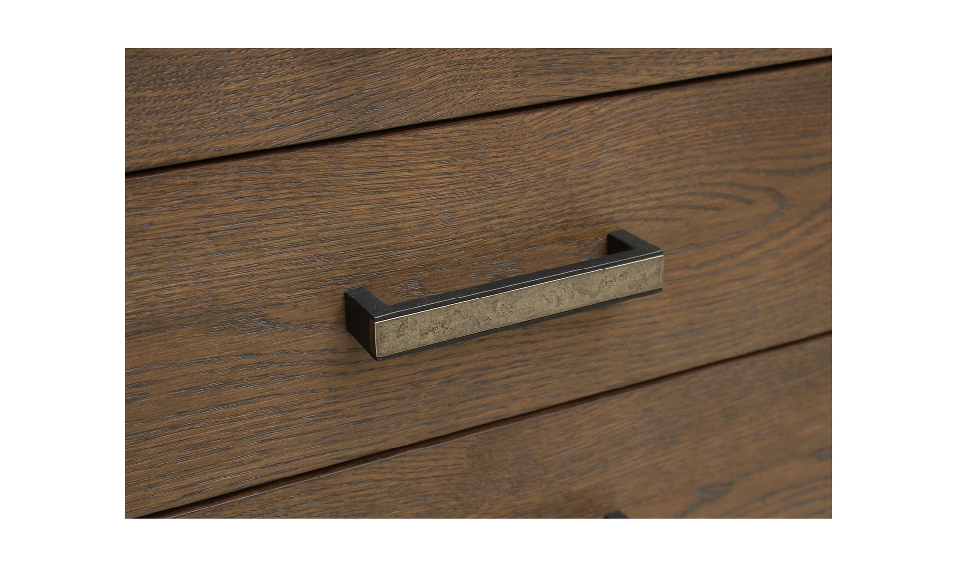 Crafted from solid oak with a distressed brown finish, the Caleb nightstand harmonizes strength with weathered sophistication. Clean lines and balanced proportions create a sense of tranquility, while the subtle rustic air complements various interior styles. Three spacious drawers offer ample storage, a testament to well-considered, well-crafted design.