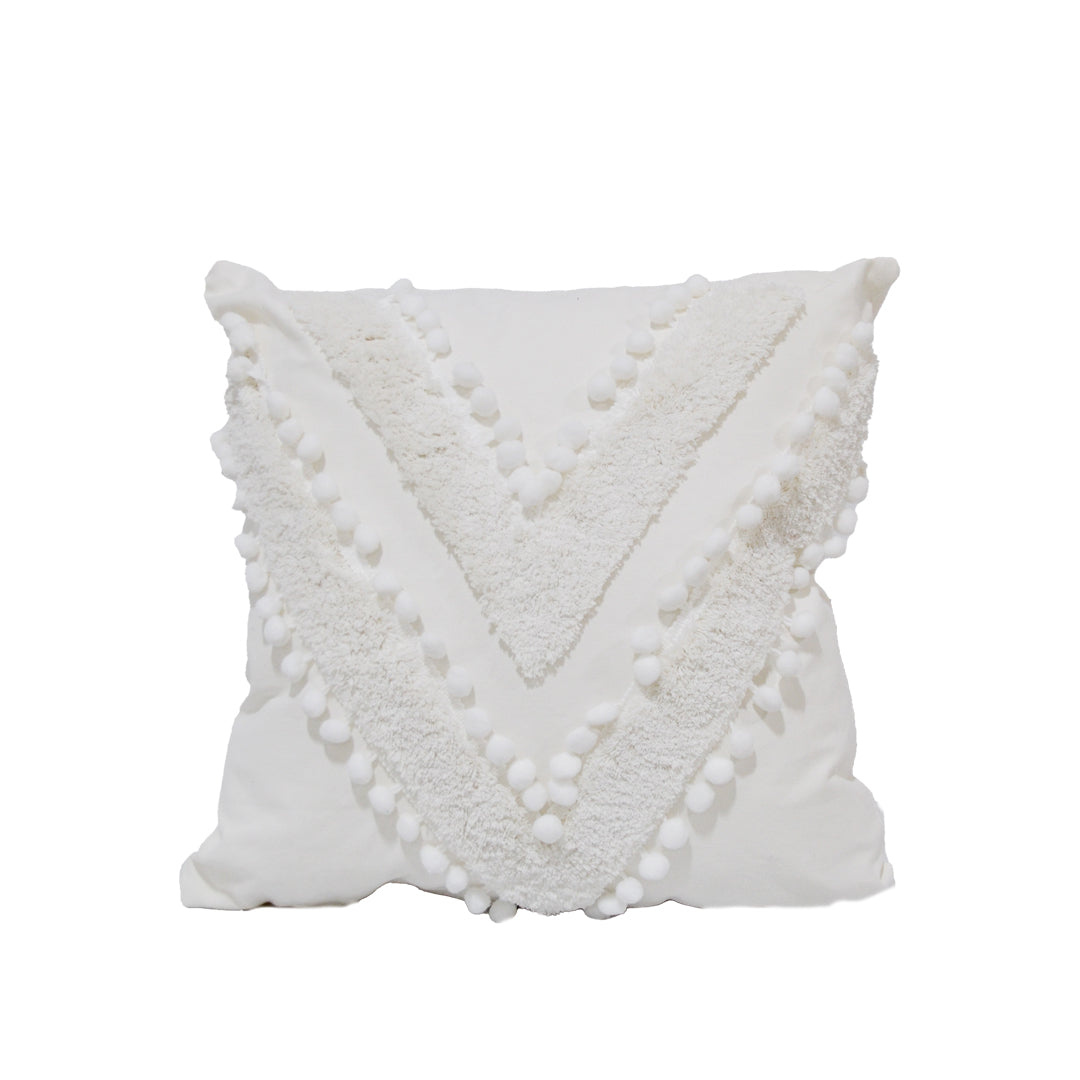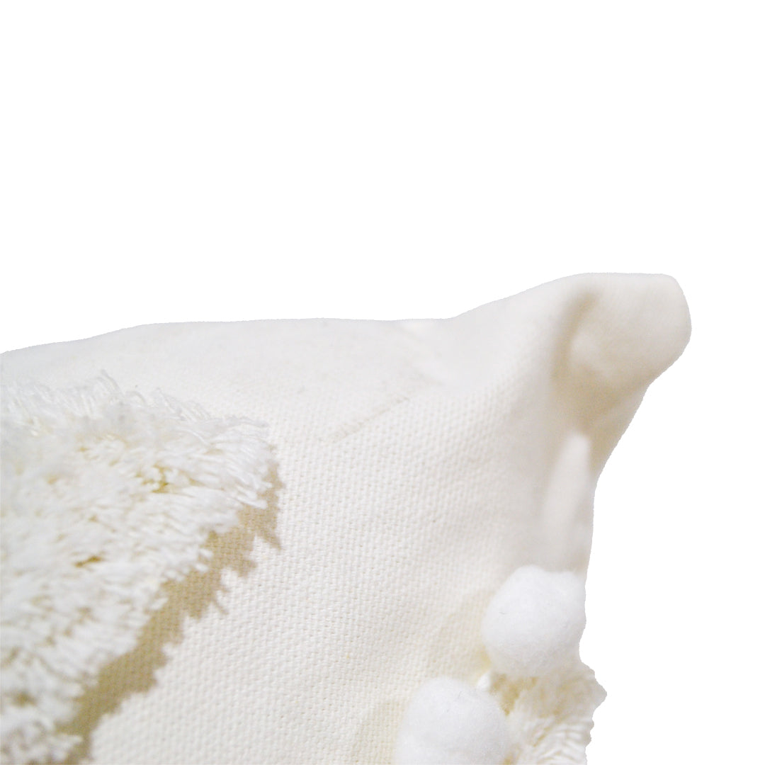 A glam white tufted cushion with pompoms that is sure to elevate your decor!