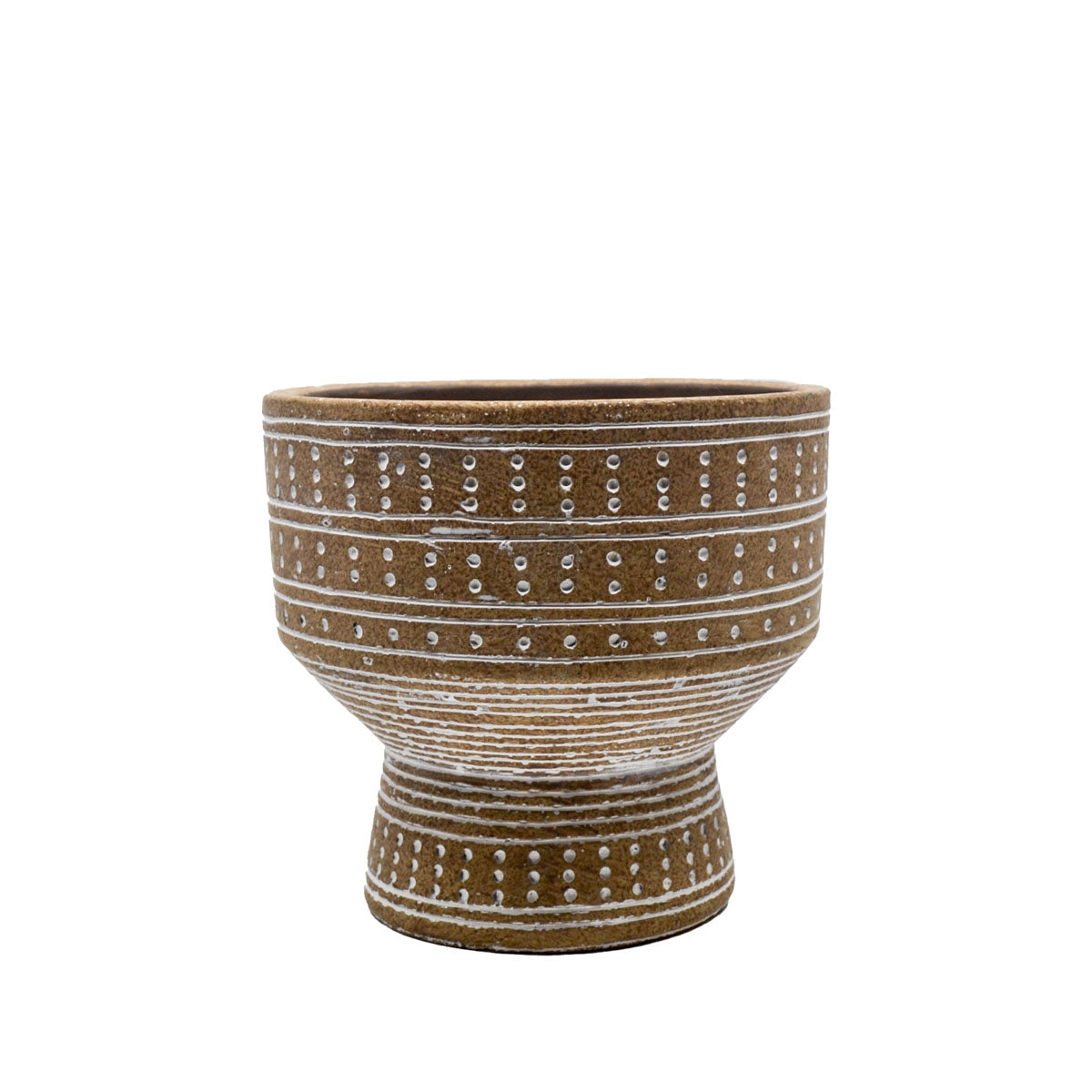 Complement your favourite plant, cacti or succulent with this elegantly rustic Small Dotted Pedestal Planter. Crafted out of cement, this brown Pedestal planter is accented with a tribal-esque series of dots and stripes for an understated complement to any style of decor.