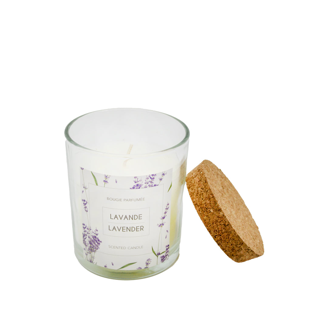 Lavender scented candle in glass pot with lid. This clean, fresh scent brings a lightness to your space while adding a clean piece of decor.