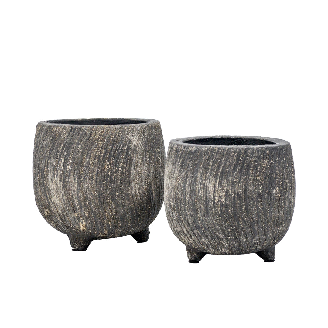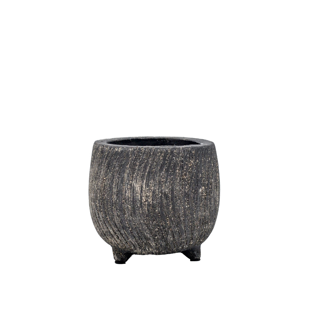 Cement flower pot on small raised legs. Rough texture brings a natural feel to your decor.