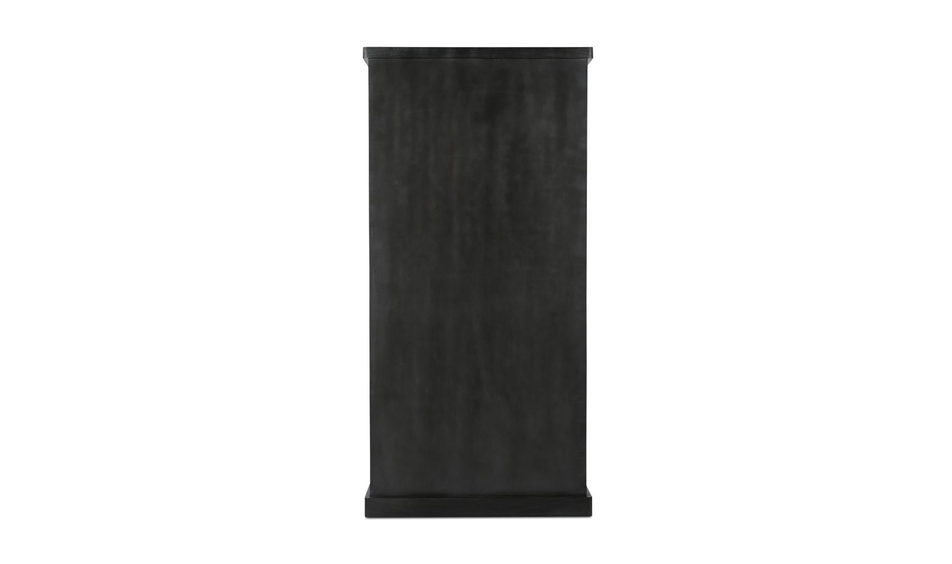 The Mona tall cabinet elegantly merges rustic charm with modern design, adding a contemporary touch. Its sleek black frame, rounded corners, and warm brown interior deliver a sophisticated contrast suitable for traditional and transitional settings. With sliding glass front doors, it optimizes space while elegantly displaying and protecting items inside.